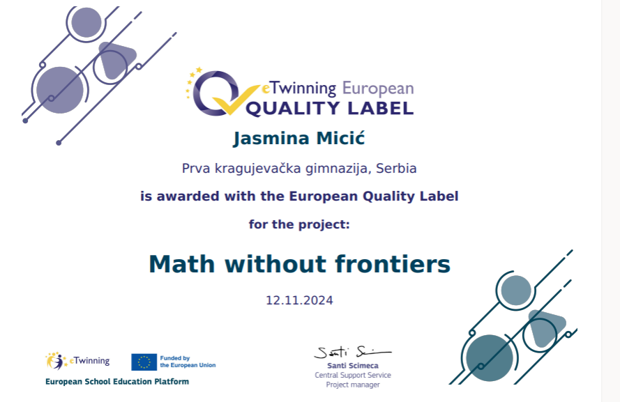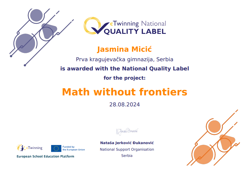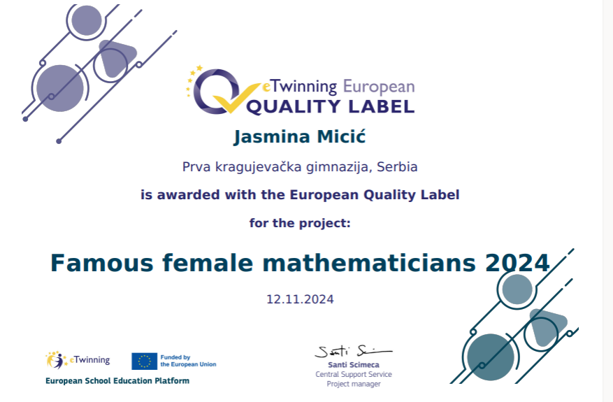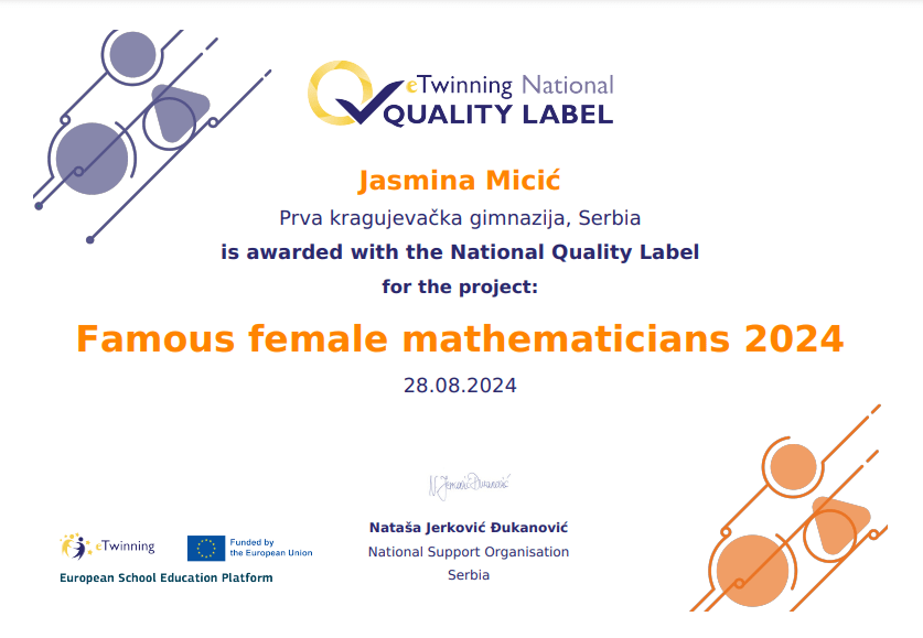 Стигла су нам и признања Европска ознака квалитета, за пројекте „Famous female mathematicians“ и „Math without frontiers“!