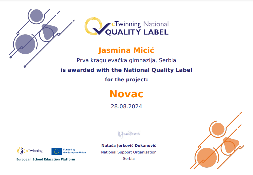 За ангажовање наших ученика у ова три пројекта, на Националној годишњој eTwinning конференцији „Благостање у школама – темељ успешног образовања“ одржаној 13. септембра 2024. у Београду, додељено је признање Национална ознака квалитета.